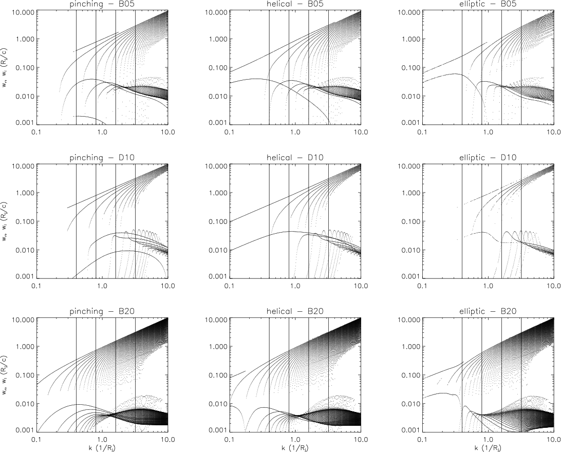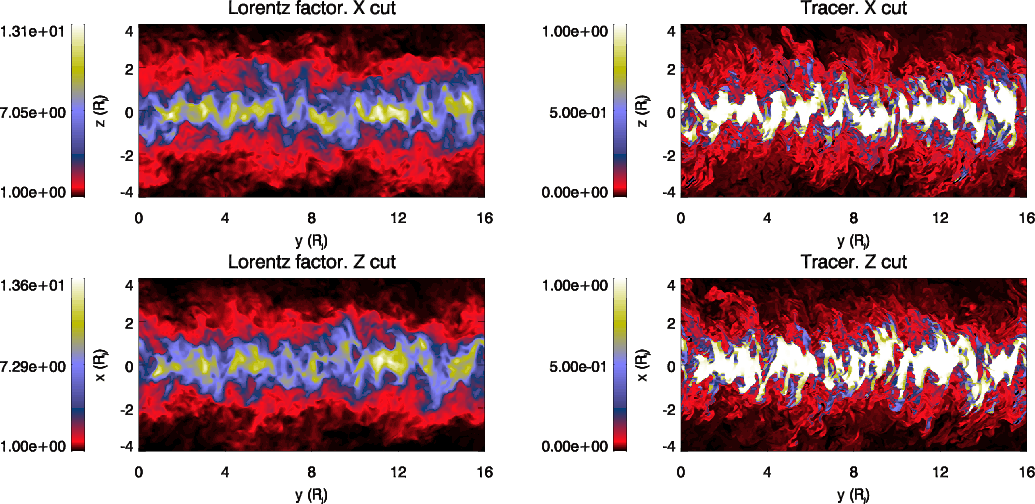 Jet stability in the relativistic regime has been thoroughly studied in different scenarios and parameter ranges (see Hardee 2006, for a recent review on the state-of-art), from both the analytical and numerical perspectives. The linear analysis of KH instability in relativistic flows started with the work of Turland & Scheuer (1976) and Blandford & Pringle (1976), who derived and solved a dispersion relation for a single plane boundary between a relativistic flow and the ambient medium. Next, Ferrari et al. (1978) and Hardee (1979) examined properties of the KH instability in relativistic cylindrical jets. The effects of a shear layer have been examined by Urpin (2002). More recently, Hardee (2008) has studied the stability of magnetized relativistic jets with poloidal magnetic fields.