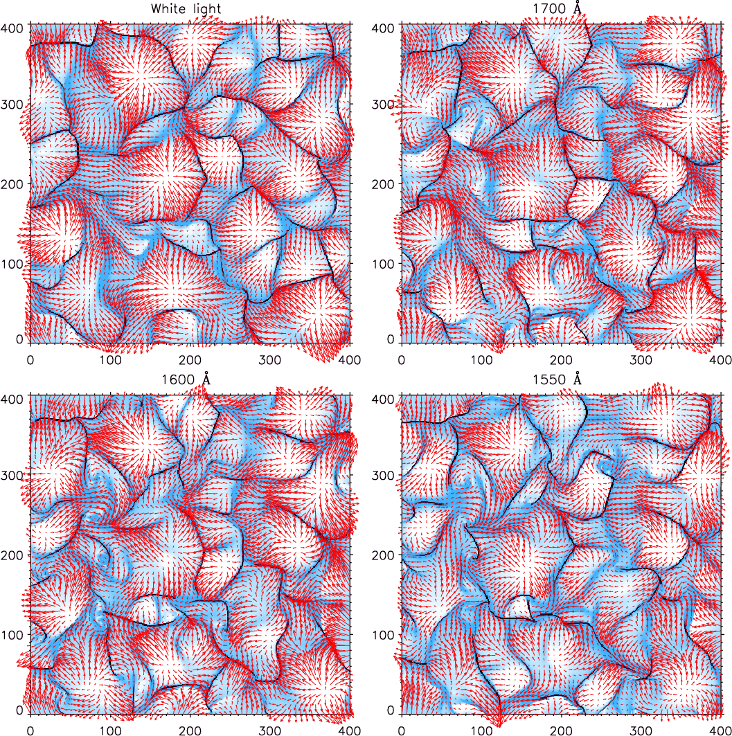 Under the assumption that the granules can be considered as tracers of the underlying larger-scale velocity fields (Rieutord et al. 2001; Simon et al. 1988) of magnetoconvection, one can derive the related horizontal flow speed by the widely used LCT (Local correlation tracking) technique (November & Simon 1988). Recently, Potts et al. (2004) developed a new method for tracking flow fields. This so called balltracking method is more noise-tolerant and highly efficient for analysing large data sets. The flow field inferred by this method has a similar accuracy to that obtained by LCT.