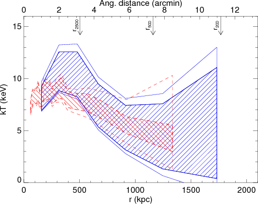 decrease of gas temperature in the cluster outskirts, and also measure