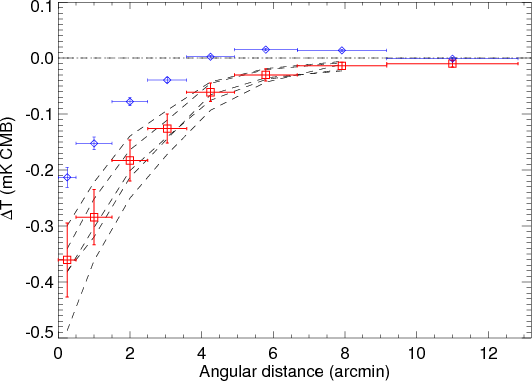 Radial profile of the SZE temperature decrement at 150 GHz.