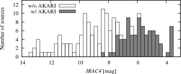 Figure 5: Histogram of the IRAC4 magnitudes of the PMS stars listed in Table 4 by Rebull et al. (2010). The filled and open bars indicate the sources that were detected and not detected with AKARI, respectively. The size of the magnitude bin is 0.25 mag. |