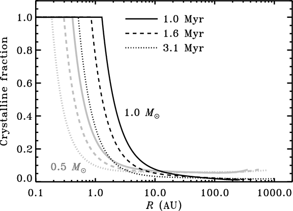 Another problem addressed with these 1D parameterised models is the origin, evolution and transport of gas and dust in circumstellar disks. For instance, Dullemond et al. (2006a, hereafter DAW06) suggested that the initial outward expansion of the disk during the disk formation phase (observationally the Class 0/I phase) may be very effective in transporting thermally processed dust to the outer parts of the disk. Based on that work, one would expect to find a number of disks with nearly 100% crystalline dust. However, no such extremely crystalline disks are observed (Bouwman et al. 2008; Watson et al. 2009). This is one of the issues addressed in this paper.
