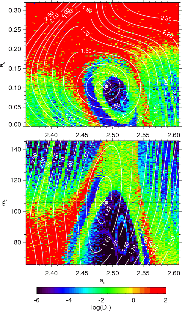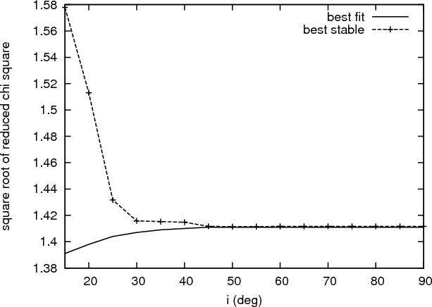 GAMP algorithm (Gozdziewski et al. 2006). They provide two possible solutions (among many others), one coplanar and one with a very high mutual inclination.
