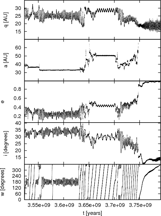 Figure 8: Dynamical evolution of the orbital elements of an escaped plutino injected into the Centaur zone. |