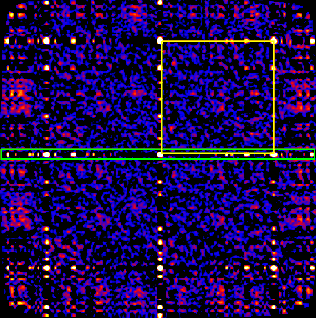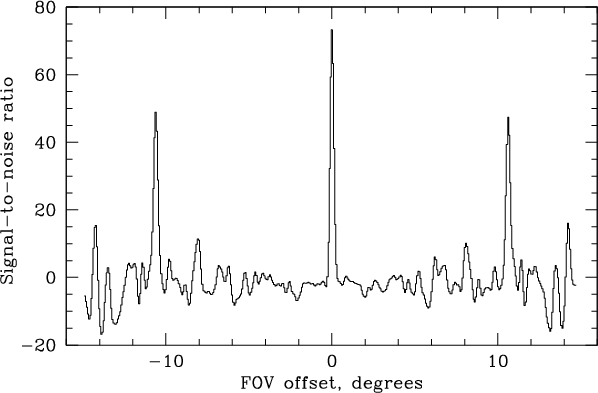 IBIS mask has replicated patterns (see Reglero et al. 2001; Ubertini et al. 2003; Goldwurm et al. 2003). This pattern of the mask has an advantage because, ideally, it has a much narrower point spread function and flat side lobes in the central part of the reconstructed image (Fenimore & Cannon 1978). But at the same time it causes serious complications because of the very significant side peaks of the point spread function. This means that a simple deconvolution algorithm sees ``ghost'' sources at certain sky positions (see Figs. 1 and 2), related to the position of the real source and the size of the replicated mask pattern.