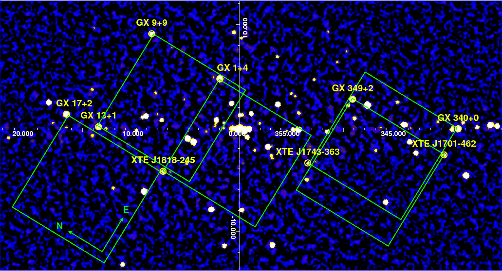The sources in a variety of sky positions within a field of view create shadows with similar patterns, which causes uncertainty in the source flux determination (the direct solution of Eq. (1) is impossible). Unfortunately, this situation is not rare in the crowded field of the GC, as shown in Fig. 3. Due to observational constraints, IBIS FOV was mainly co-aligned with axes of the equatorial coordinate system (``N-E'' notation). As a result, there are a number of bright sources which permanently appeared in mutual ``ghost'' positions. This leads to an additional uncertainty of the source flux determination. The following source pairs can be affected by mutual flux interplay: GX 340+0 and XTE J1743-363, XTE J1701-462 and GX 349+2, GX 9+9 and GX 13+1, and the triplet GX 1+4, XTE J1818-245 and GX 17+2.