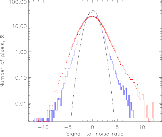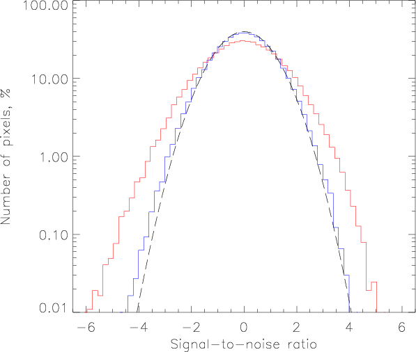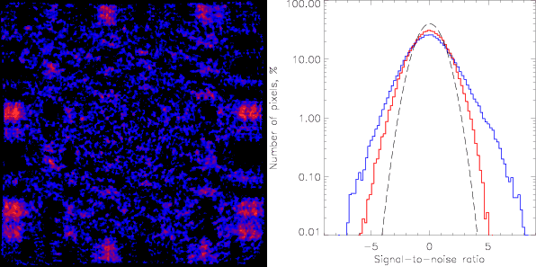 Figure 6: Left: the sky mosaic of 280 ks observation of NGC 4151 in staring mode. The Ridge contribution (Fig. 5, right) was artificially added to the detector plane for each individual observation. For reference see the left image in Fig. 8. Right: S/N distribution of a number of pixels in a reference and current sky images shown by red and blue histograms, respectively. The long dashed line represents the normal distribution with unit variance and zero mean. |
