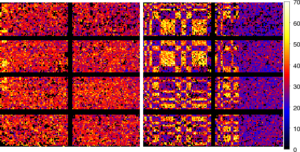 Figure 5: The contribution of Galactic X-ray background to the ISGRI detector count rate for different alignments of the GP in the IBIS FOV (see also Fig. 4). The detector count rate normalization is estimated from actual observation of the GC in the energy range 17-60 keV. The corresponding images in Figs. 4 and 5 are co-aligned in detector coordinates. The ridge, appearing in the given FOV corner, illuminates the opposite corner in the detector image. |