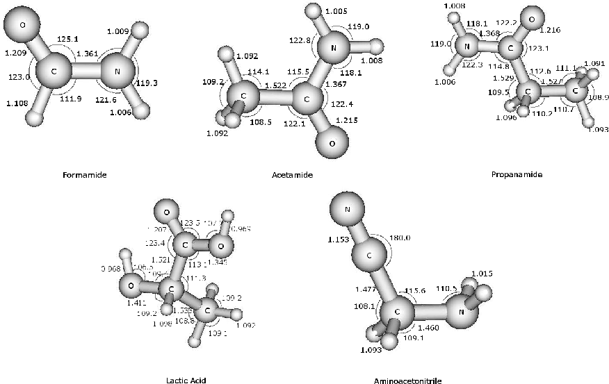 On another hand, the Strecker synthesis has already been proposed to explain the formation of these species in meteorites (Bernstein et al. 2004; Peltzer et al. 1984; Ehrenfreund et al. 2001). A major intermediate step in the process is the formation of an aminonitrile that leads to the desired amino acid by hydrolysis. In this spirit, aminoacetonitrile NH2-CH2-CN, has been proposed as a possible glycine precursor about thirty years ago (Brown et al. 1977). It was detected two years ago in the direction of Sgr B2 (Belloche et al. 2008).