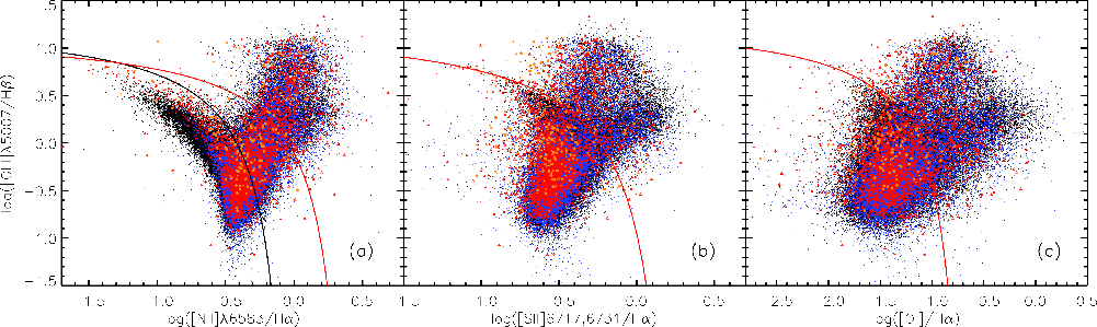 theoretical maximum starburst line on the three BPT diagrams. Kauffmann