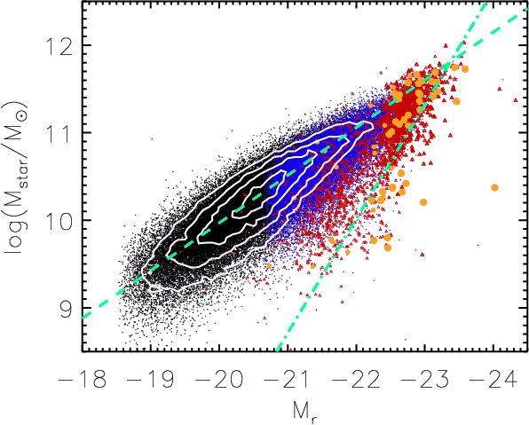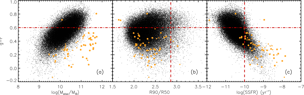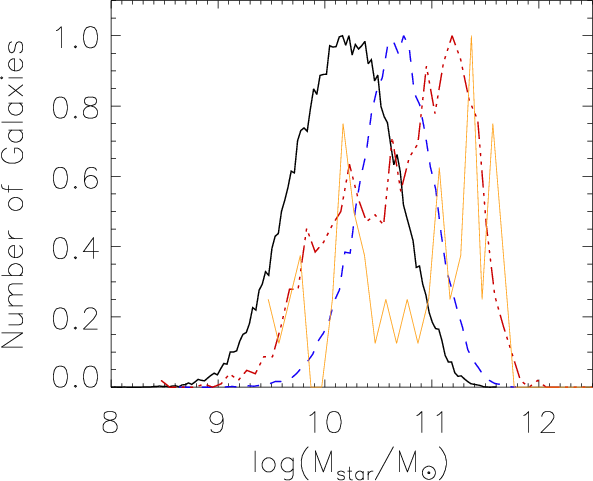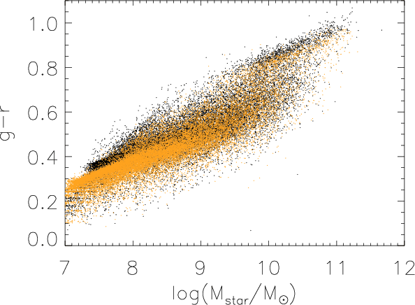 15: Mass versus g-r color for Millennium galaxies. Black and yellow dots represent galaxies at z0 and z3, respectively. (See the electronic edition of the Journal for a color version of this figure.) |