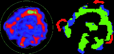 Figure 7: Left panel: Chandra image of SNR 0519-69.0. Outer and inner regions that were considered are outlined with green lines. Right panel: the masks of the Chandra image of SNR 0519-69.0: red - oxygen (0.5-0.7 keV), green - Fe-low (0.7-0.9 keV), blue - Fe-high (0.9-1.1 keV). |