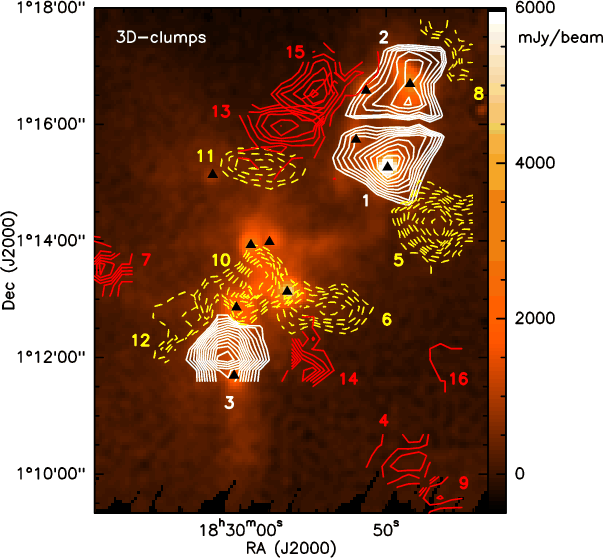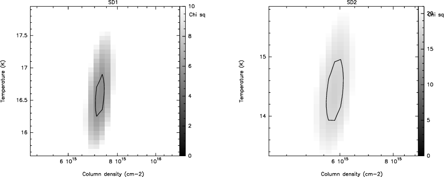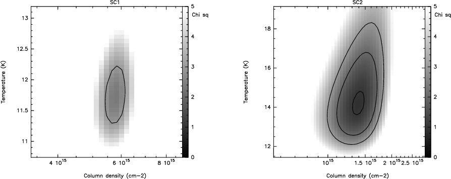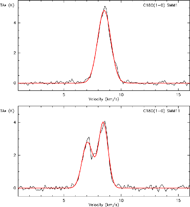 Table B.1 presents the best fit integrated intensities from the non-LTE (RADEX) modelling (Appendix A) , together with the observed values, and the implied C18O abundances.