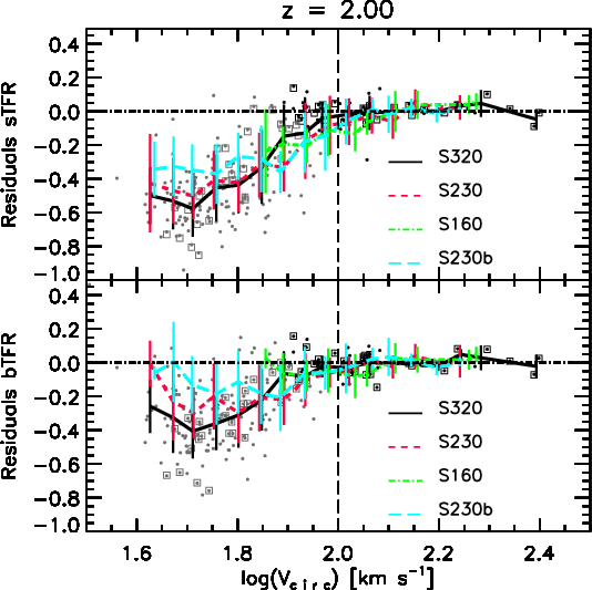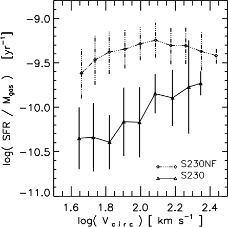 In fact, cosmological simulations that include this process obtained sTFRs in more qualitative agreement with observations (Governato et al. 2007; Croft et al. 2009).