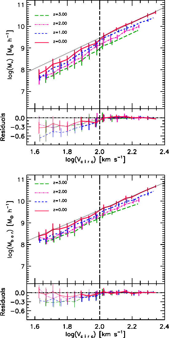 to z=0. For the baryonic relation, our model predicts a slightly weaker evolution of