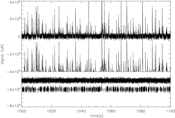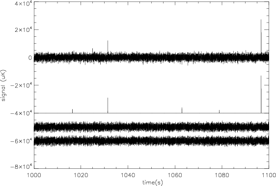 In Figs. 1 and 2, we show sample subsections of simulated data. Large CR spikes are evident, but smaller ones remain hidden in the noise.