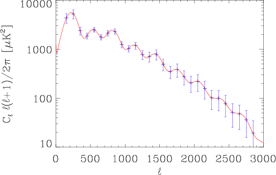 Figure 9: Simulated measurement of the power spectrum of CMB anisotropy in a bolometric experiment affected by CR hits as in case R1. The noise estimate neglects the presence of CR spikes. As a result, the spectrum is heavily biased (black crosses show this residual). |