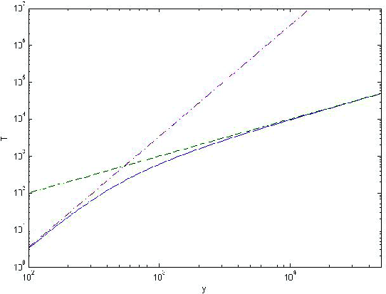 Comparison of exact solution y(T) (full curve) with asymptotic solution y1(T) at early times
