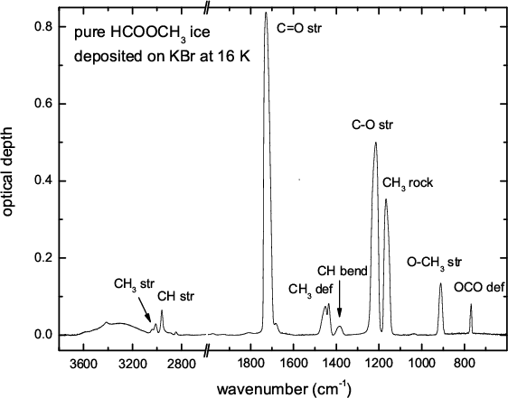 Methyl formate has not yet been observed in the solid state as a component of icy grain mantles because its strongest bands overlap with those from other present and more abundant molecules. Both CO and CH3OH are found to be abundant within the grain mantles. Recently, it was experimentally shown that CH3OH can be produced efficiently by successive hydrogenation of CO (Watanabe et al. 2007; Fuchs et al. 2009). As a consequence, these two components are supposed to reside well mixed in the icy mantles.