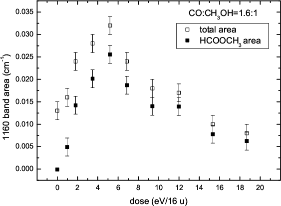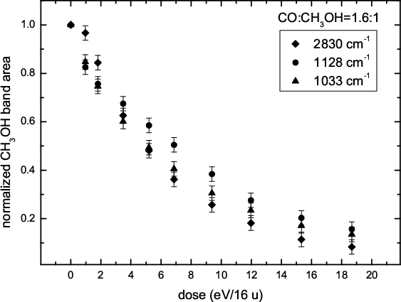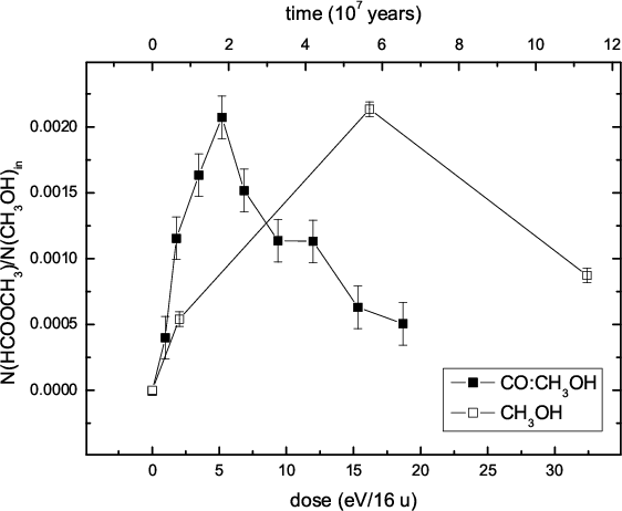 destruction of methyl formate after irradiation of CH3OH and a CO:CH3OH mixture.