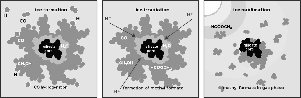 One of the open questions about methyl formate is to explain its abundance in the interstellar medium. Although it is generally accepted that methyl formate can be produced from methanol formed in the icy grain mantles, models based only on gas-phase reactions are unable to account for the observed abundances. Until a few years ago it was thought that methyl formate could be formed in the gas phase after the sublimation of icy mantles containing H2CO and CH3OH. Horn and colleagues studied the specific sequence of reactions that was supposed to lead to the synthesis of methyl formate (Horn et al. 2004). The results of their theoretical and experimental gas-phase study have conclusively shown that the processes in the gas phase are unable to produce sufficient amounts of methyl formate. This evidence has profoundly changed the standard production scenario suggesting that methyl formate should be produced mainly by reactions in ices rather than in gas phase. Nowadays new routes of formation and destruction have been proposed in literature, pointing to a much more important role for grain surface reactions and energetic processing of icy mantles than previously believed. Mixtures of methanol and carbon monoxide ices were irradiated at 10 K with energetic electrons (Bennett & Kaiser 2007), establishing the formation of glycolaldehyde and methyl formate. Furthermore methyl formate has been observed after UV photolysis of pure CH3OH and CO:CH3OH ice mixtures (Gerakines et al. 1996; Öberg et al. 2009).