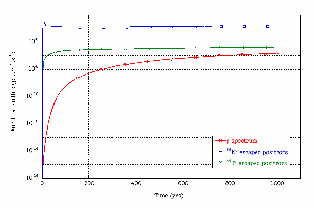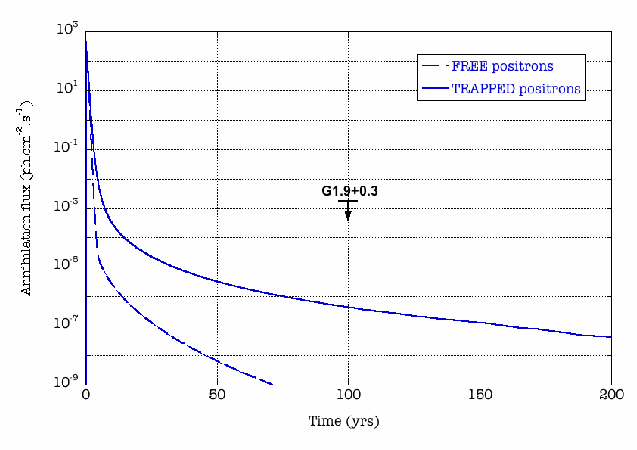 - In the trapped case, one may have the impression that the lightcurves are non-physical since after following the decay curve, they rise above it thereby suggesting that more positrons are annihilated than created. This is a misleading effect of the many orders of magnitude spanned by the lightcurves. Actually, only a tiny fraction of the positrons created over the first years annihilate with a delay and the delayed emission a few decades after the explosion is accordingly tiny compared to the flux levels of the early years.