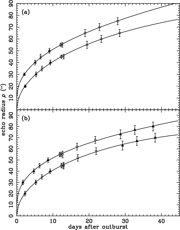 sight, rather than physical expansion of material ejected by the star (Couderc 1939). Light echoes