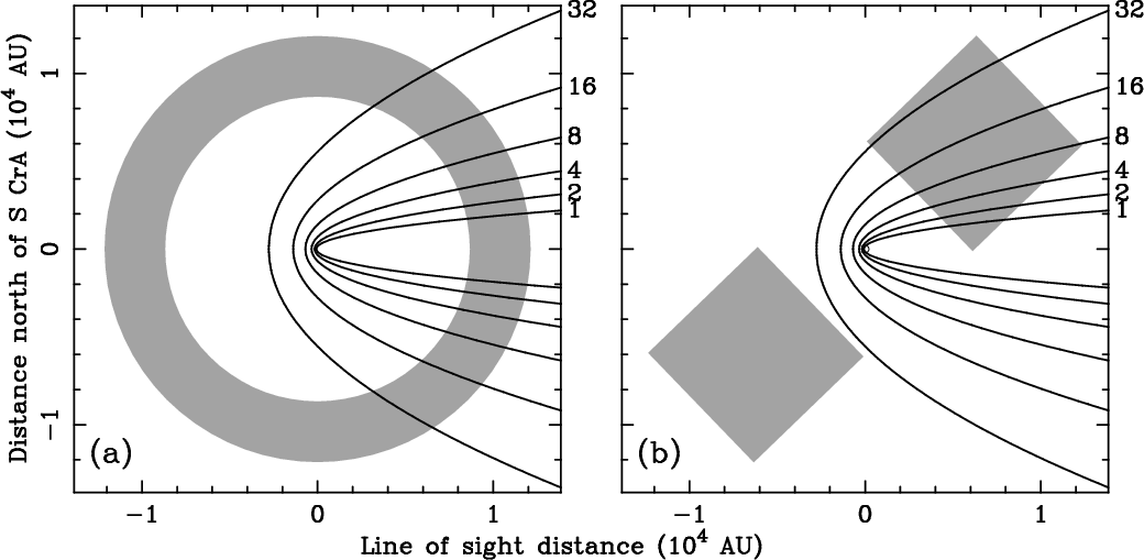 We must caution the reader that we have presented just a first order model to explain the echoes around S CrA. A well sampled lightcurve of SCrA and high spatial resolution images would be needed in order to derive the detailed 3-dimensional structure of the dust surrounding S CrA.