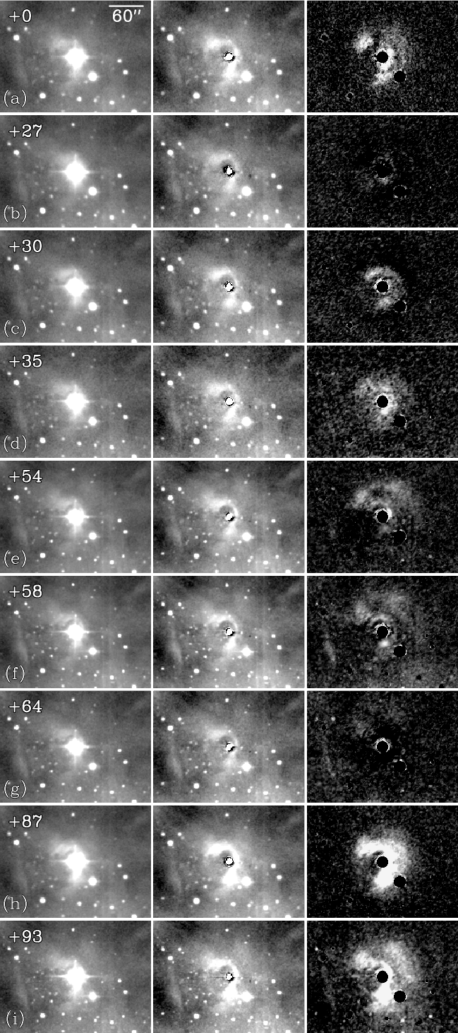 Figure 2: Temporal sequences of images of S CrA, showing ( left) direct images, ( middle) direct images with the flux of S CrA removed via PSF subtraction, and ( right) difference-only images. All panels are 270 by 200 arcsec, with north up, and east to the left. The number of days after the first epoch are indicated at top-left of each row. |