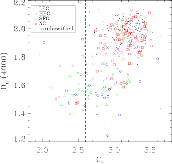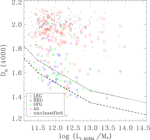 - Best et al. (2005b) divided the sample into two classes: RLAGN and galaxies in which the radio emission is dominated by star formation. The division is based on the location of a galaxy in the plane of 4000-Å break strength versus radio luminosity per unit stellar mass, see Fig. 6.