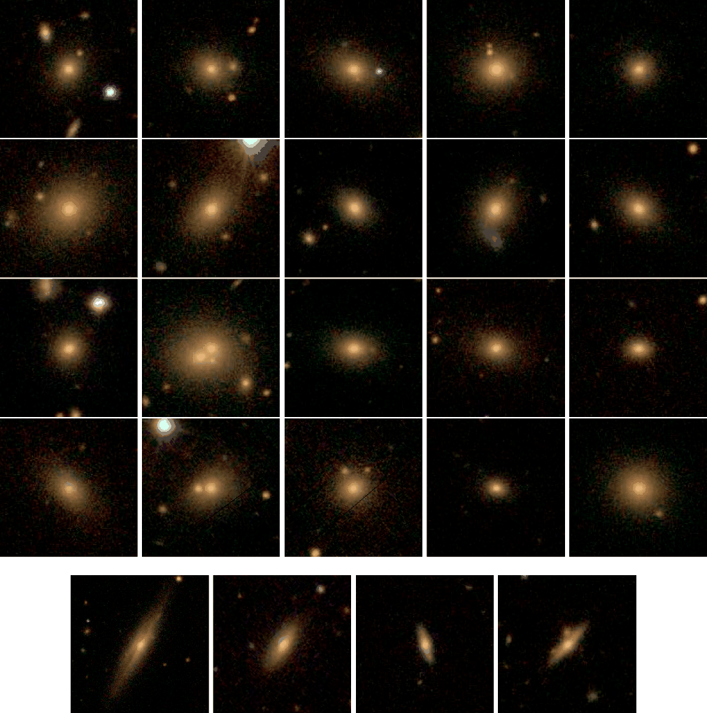 massive galaxies, usually of the early Hubble type, with stellar masses