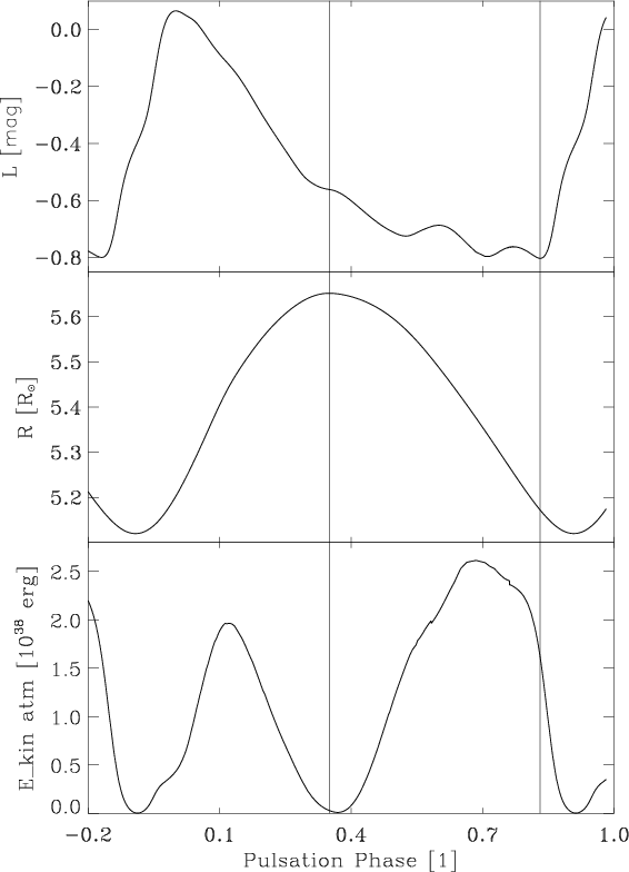 X = 0.7, and Y = 0.299. The model generated with the Vienna Nonlinear Pulsation Code shows a maximum, during one pulsation cycle,
