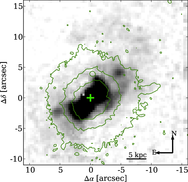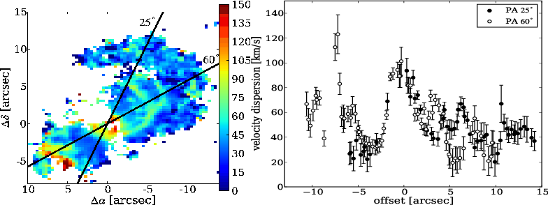 Spatially resolved on-nuclear longslit spectroscopy for this object was presented by Let07 and Jah07. Both studies consistently found highly ionised gas in the host galaxy on kpc scales. Jah07 found that the stellar component is non-rotating, but the velocity curve of the ionised gas indicated the presence of a rotating gas disc on kpc scales around the nucleus. Let07 argued instead that the velocity curve does not fit with a pure rotational velocity field based on inclination arguments.
