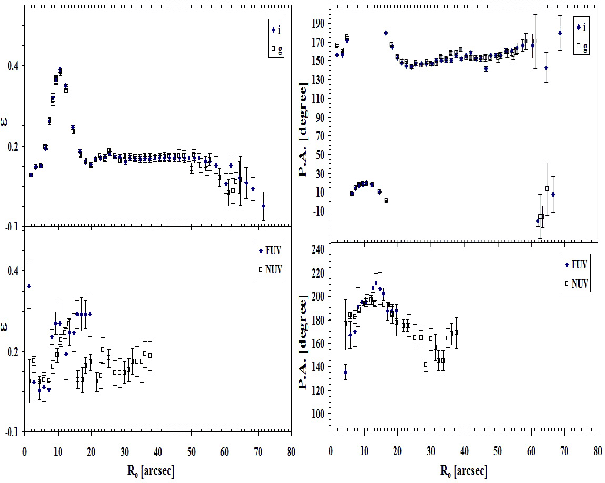 Figure 4: Position angle and ellipticity profiles for both optical and UV images of NGC 4262. Upper left panel: optical ellipticity profile. Upper right panel: PA optical profile. Lower left panel: UV ellipticity profile. Lower right panel: PA UV profile. |