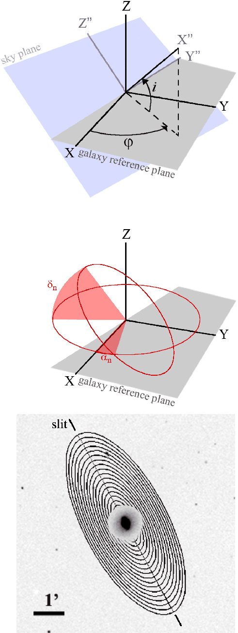 Figure A.1: Top panel: the angles of the observer with respect to the galaxy reference plane. Mid-panel: the inclination of a ring with respect to the galaxy reference plane. Bottom panel: image of the model rings plotted on a DSS I image of NGC 4262. A circular ``hole'' has been created in the rings image only to make the galaxy visible. The outermost ring is at 200 arcsec, corresponding to the extension of the HI ring visible in the other figures of this paper. The straight line across the rings indicate the position of the slit used for extracting the model velocity values. |
