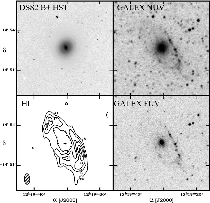 Comparison of the optical (B+HST/ACS F475W) image of NGC 4262 ( upper left), with GALEX NUV and FUV images ( upper and lower right, respectively, and the smoothed HI column density ( lower left). Contours are 0.8, 1.6, 2.4, 3.2, and