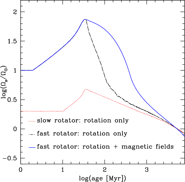 As mentioned in the introduction, the observation of rotational periods of young solar-type stars suggests that slow rotators develop a high degree of differential rotation between the radiative core and the convective envelope, while solid-body rotation is favoured for fast rotators. Because shellular rotation alone produces an internal coupling that is insufficient to ensure solid-body rotation (Chaboyer et al. 1995; Pinsonneault et al. 1989), this suggests that another effect intervenes for fast rotators. Two main mechanisms have been proposed to efficiently extract angular momentum from the central core of a solar-type star: magnetic fields (e.g. Mestel & Weiss 1987; Denissenkov 2010; Eggenberger et al. 2005; Charbonneau & MacGregor 1993) and internal gravity waves (e.g. Charbonnel & Talon 2005; Kumar & Quataert 1997; Talon & Charbonnel 2005; Schatzman 1993; Zahn et al. 1997). We recall here that the theoretical prescription for a dynamo operating in the radiative zone of a star (see e.g. Denissenkov & Pinsonneault 2007) as well as its real existence (Gellert et al. 2008; Zahn et al. 2007) is still a matter of debate. It is beyond the scope of the present paper to study in detail the theoretical description of such a dynamo and in particular the physical conditions needed for this mechanism to operate. We simply note that observations of rotational rates of solar-type stars indicate that slow rotators on the ZAMS seem to exhibit internal differential rotation, while a strong internal coupling is favoured for fast rotators on the ZAMS. Consequently, slow rotators are modelled in the present study with shellular rotation only, while fast rotators are modelled with both rotation and the Tayler-Spruit dynamo to produce an internal coupling that is sufficient to ensure solid-body rotation. Note that the inclusion of both rotation and magnetic fields is assumed for fast rotators on the ZAMS during the whole evolution. The variation with time of the surface velocity of these models for fast and slow rotators on the ZAMS is shown in Fig. 1, together with the evolution of the surface velocity of a model for fast rotators including shellular rotation only. Figure 1 clearly shows that shellular rotation alone does not couple the core and envelope even in the presence of rapid rotation. This illustrates the need to introduce an efficient mechanism for the transport of angular momentum for fast rotators, because the rapid decrease of the surface angular velocity observed for this model cannot correctly reproduce the spin-down of fast rotators in open clusters (e.g. Denissenkov 2010).