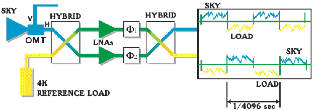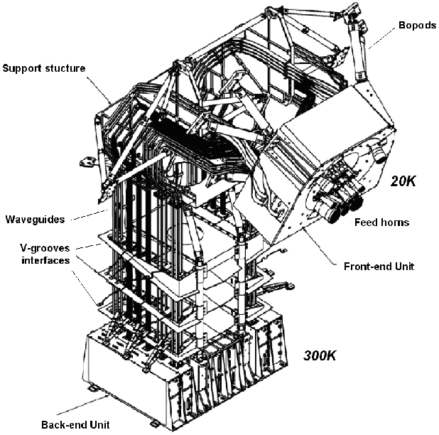 Figure 8: Schematic of the LFI front-end radiometer. The front-end unit is located at the focus of the Planck telescope, and comprises: dual-profiled corrugated feed horns; low-loss (0.2 dB), wideband (>20%) orthomode transducers; and radiometer front-end modules with hybrids, cryogenic low noise amplifiers, and phase switches. For details see Bersanelli et al. (2010). |
