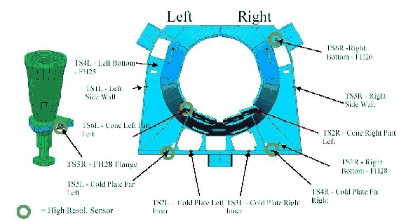 Figure 21: Temperature sensors in the LFI front end unit. Circles indicate high-sensitivity sensors. |