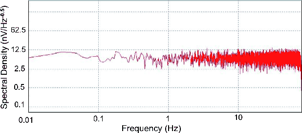 Figure 16: Noise spectral density of the FM readout electronics. The level of 5.5 nV Hz-0.5 is obtained over the range 0.01 Hz to 600 Hz. |