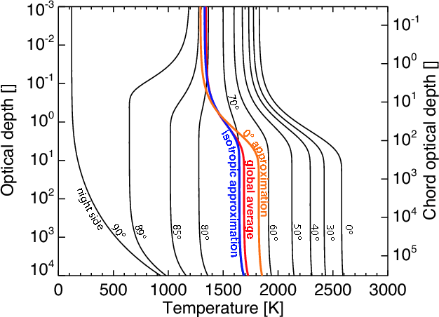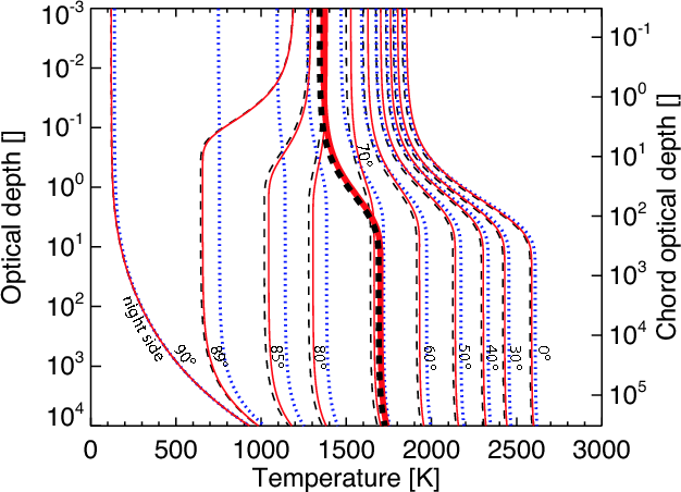Figure 10: Temperature-optical depth profiles for different inclinations of the incident light. The figure is as Fig. 2, but it compares the solutions obtained from Eq. (27) (dashed black lines), Eq. (65) (plain red lines), and the solutions of Hansen (2008) (dotted blue lines). The thick curves in the middle correspond to global averages (see Eqs. (49) and (67) respectively). |