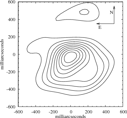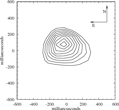 (elliptical) Gaussian width of 330 mas by 280 mas (2300 AU by