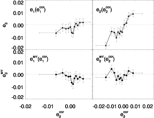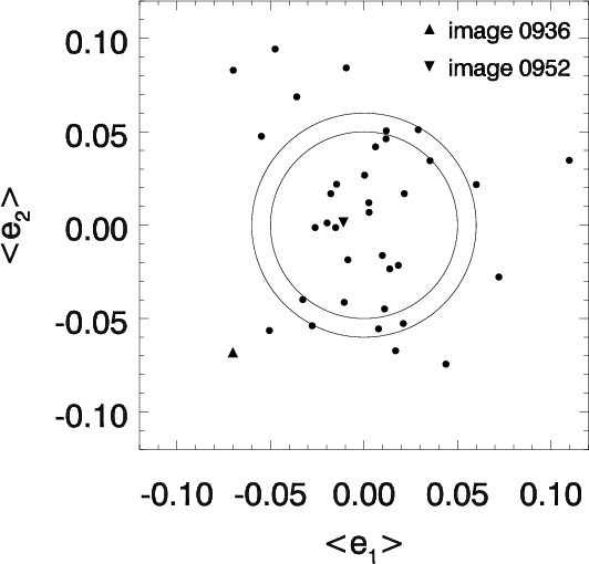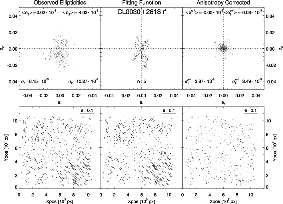 A.2: Spatial distribution of stellar anisotropies for example exposures of high (upper panel) and low (lower panel) overall PSF anisotropy. Shown are the sizes and orientations of the raw ellipticity e for stars identified in the MMT MEGACAM exposures of CL0030+2618labelled 0936 and 0952 in Fig. A.1. While within each chip the x and y pixel axes are to scale; the array layout is only schematic. |