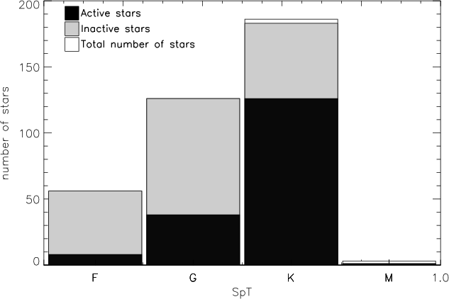 The stellar sample comprises 371 cool stars in the solar vicinity, constrained to be at distances closer than 25 pc (see Table A1). Distances were obtained from the Hipparcos Catalogue (ESA 1997) and the New Reduction of the Raw Data (van Leeuwen 2007). The spectral type distribution of the sample is 56 F type stars, 126 G type stars, 186 K stars, and 3 M type stars. Since our study is based on solar-like stars, only F, G and K spectral types stars with trigonometric parallaxThese stars are potential targets for present and future projects that aim to detect Earth-like planets or exo-solar analogues to the Edgeworth-Kuiper Belt. In this context, most of our stars will be observed in the framework of DUNES (DUst around NEarby Stars), an approved Herschel Open Time Key Project with the aim of detecting cool faint dusty disks, at flux levels as low as the Solar EKB. Some preliminary results can be found in Martínez-Arnáiz et al. (2009), Maldonado et al. (2010), and Montes et al. (2010).