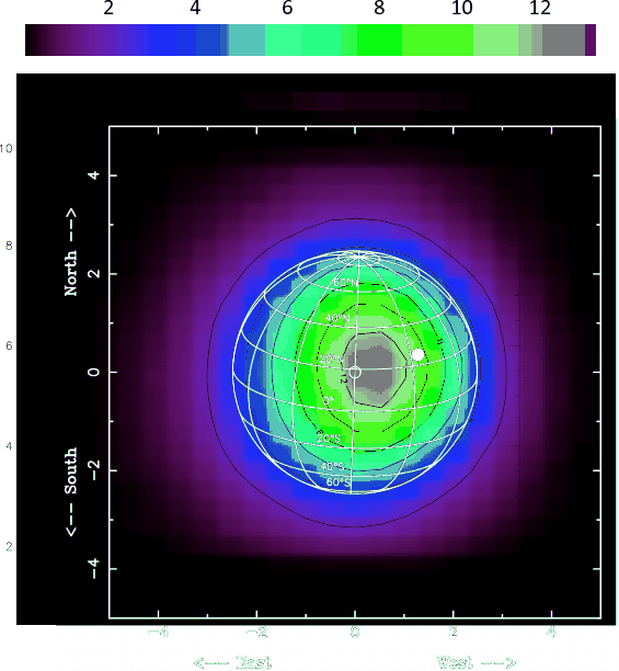 Figure 9b shows the expected water vapor mixing ratio as derived from the GCM for the conditions of our observation. This map is to be compared to Fig. 9a which shows the HDO/CO2 line depth ratio. This map cannot be directly converted in terms of the H2O mixing ratio, because this conversion implies the choice of surface and atmospheric parameters (in particular surface pressure and temperature) which vary over the disk. Thus, as pointed above, Fig. 9 only gives a qualitative estimate of the water vapor mixing ratio. As shown in Figs. 3 and 4, a line depth ratio of 0.5 corresponds to a H2O mixing ratio of 250 ppm. There is a good agreement between the estimates shown in Fig. 9a and the GCM predictions (Fig. 9b).