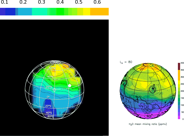 An interesting feature of the TEXES map is the slight increase of the water vapor mixing ratio from western to eastern longitudes (i.e. from morning to evening), observed over all northern latitudes. This trend is also predicted by the GCM model (Fig. 9b). To first order, we can state that the spatial distribution of the water vapor mixing ratio is well reproduced by the climate model. The GCM is calculated on the basis of dynamical effects associated with the topography of the Martian globe. The good agreement between the GCM and the TEXES data shows that, at northern latitudes lower than 60N, there is no need for any new mechanism like regolith desorption to accountfor the data. Because of the limited spatial resolution of our data, no conclusion can be derived at higher latitudes from the present analysis. Higher spatial resolutions can be achieved in the future when Mars is closer to opposition, and/or if TEXES is used on the GEMINI telescope.