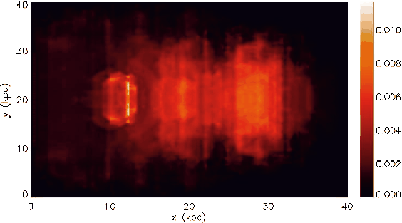 To produce an intensity map of the SZ effect by a cocoon surrounding a less powerful jet using the dynamical scaling of cocoon we choose scaling parameters equaled: Q=10, iL=-0.2, and it=-0.05. The scaled power injected by the jet is 1045 erg s-1 and the scaled size of the simulation box is 25 h-1 kpc. The intensity map of the SZ effect at a frequency 217 GHz derived from the scaling of the simulation maps of the gas pressure and temperature is plotted in Fig. A.1.