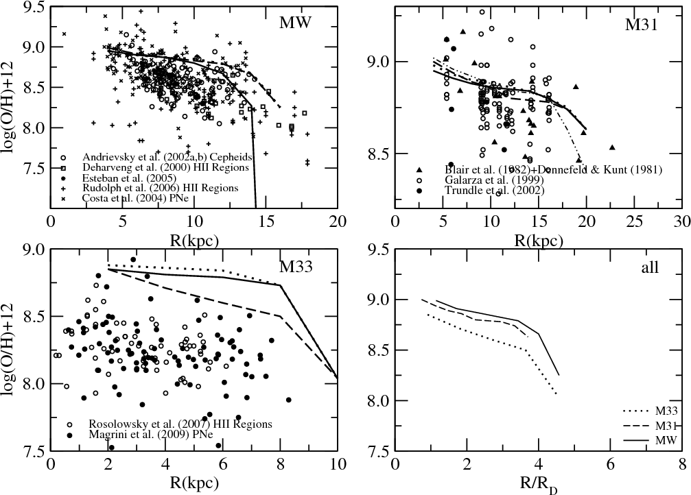 Regarding M 33, some works (e.g. Magrini et al. 2007) computed the chemical evolution of its disk reproducing the observational features by assuming a continuous almost constant infall of gas. In addition, the authors also concluded that the metallicity of M 33's disk had increased with time and that the radial abundance gradient has a tendency to flatten during the galaxy evolution.