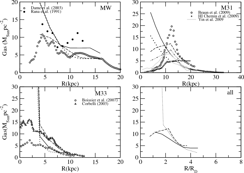 The disks of M 31 and M 33 have many similarities with the Milky Way disk but some observational constraints such as the present day gas distribution can only be explained by assuming different star formation histories for these galaxies. The SFR is one of the most important parameters regulating the chemical evolution of galaxies (Kennicutt 1998; Matteucci 2001; Boissier et al. 2003) together with the initial mass function (IMF).