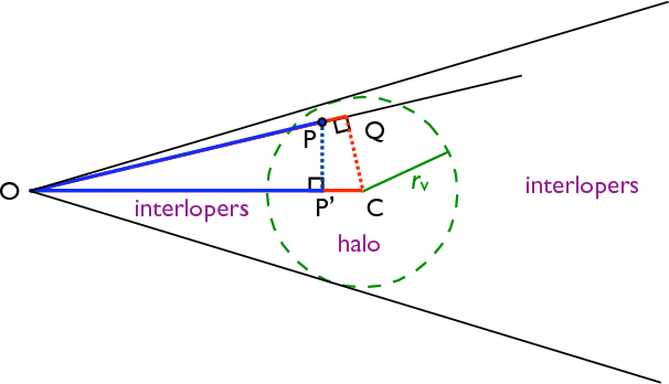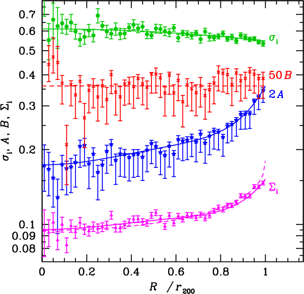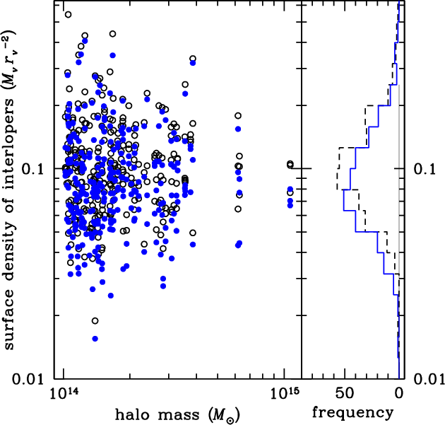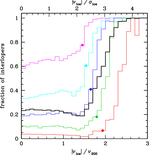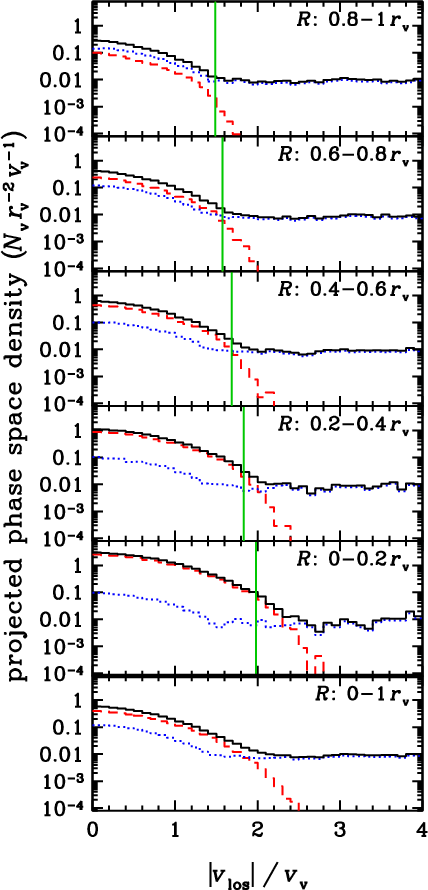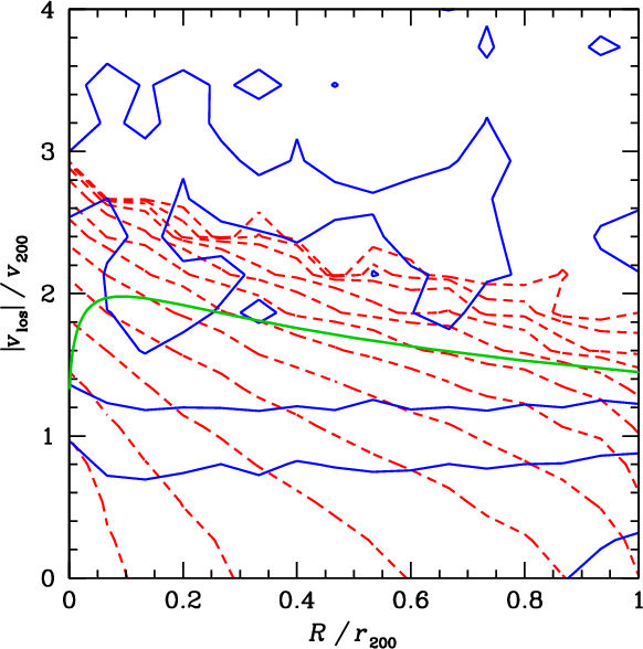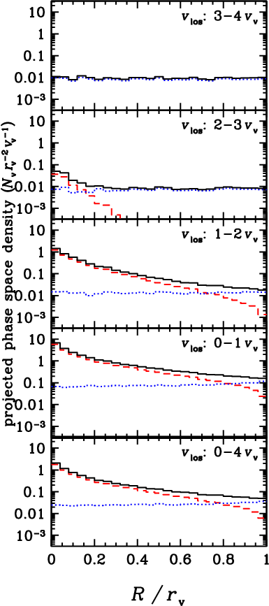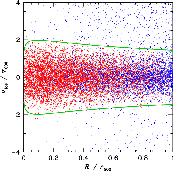 - Figure 14 shows interloper surface densities that are lower, at R < 0.7 r200, than 0.114 and 0.096 Nv rv-2, respectively before and after the velocity cut, but most of the particles lie within the highest bins of log projected radius.